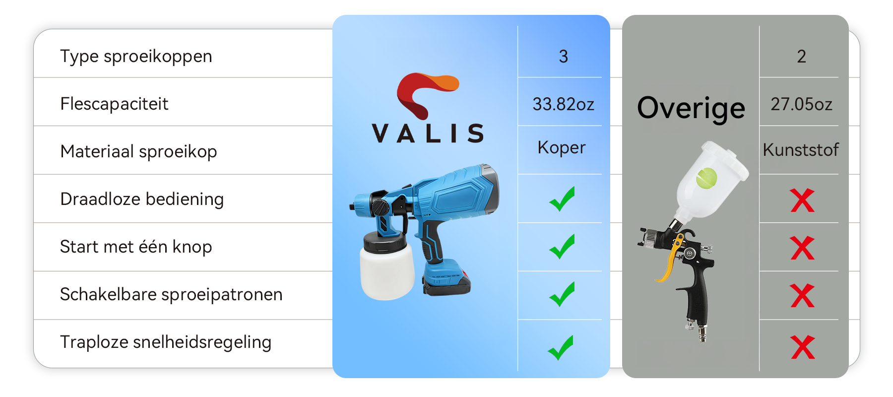 Zo werd de Valis Cordless Paint Sprayer geboren. Het krachtige, maar gebruiksvriendelijke ontwerp maakt het spuiten moeiteloos, terwijl het vlekkeloze resultaten levert. Dit weerspiegelt de kernbelofte van Valis: het transformeren van vervelende klussen in creatieve vreugde, zodat je je kunt concentreren op de kunst van je werk.